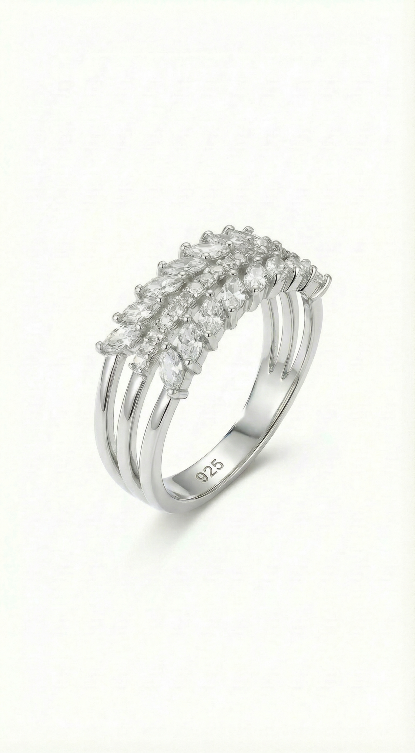 La bague Halo séduit par son design botanique sophistiqué, avec son motif de feuilles de laurier délicatement gravées et pavées de cristaux scintillants sur toute la circonférence en argent. Chaque feuille est sculptée avec minutie, créant un bijou à la fois poétique, lumineux et raffiné, qui évoque la beauté et la délicatesse de la nature.