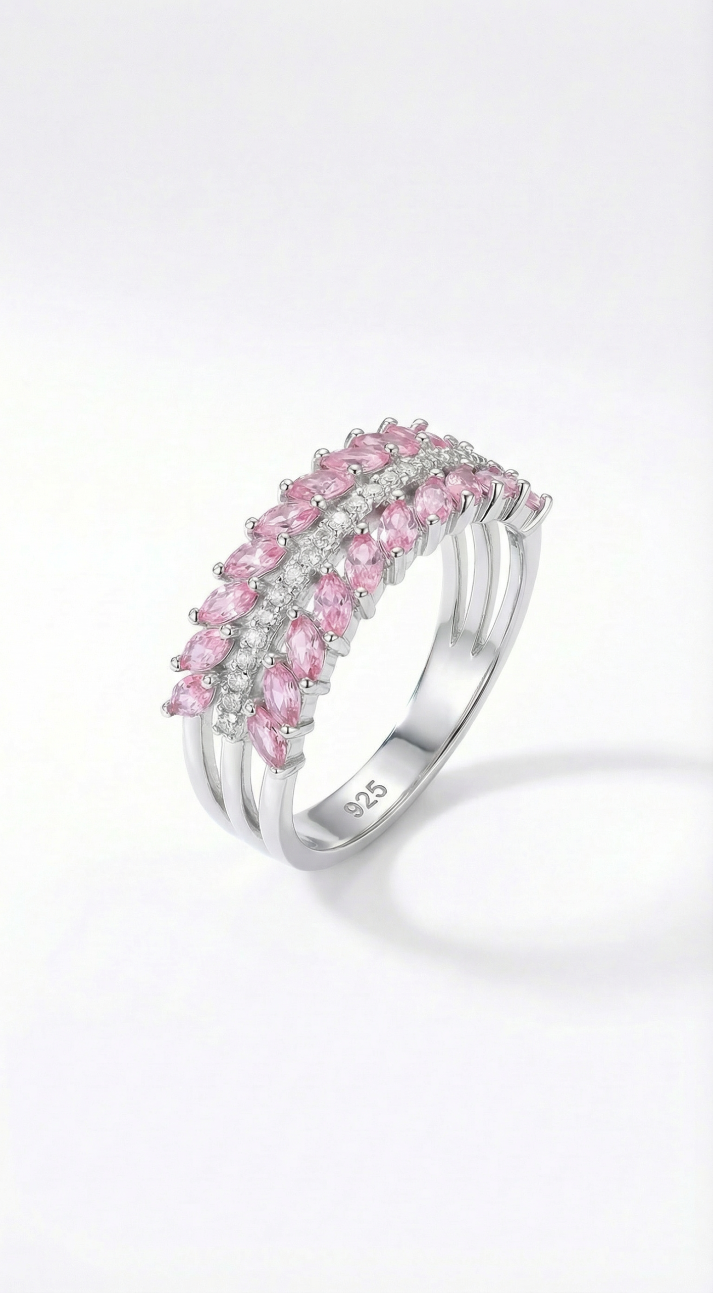 La bague Lily séduit par son design à trois rangs : deux rangs de pierres roses morganite encadrent un rang central de pierres blanches scintillantes sur un anneau en argent, créant un effet de volume sophistiqué et féminin. Les cristaux roses et blancs captent la lumière avec douceur, évoquant la délicatesse et la beauté des pétales de lys en fleur, pour un bijou à la fois raffiné, lumineux et élégant.