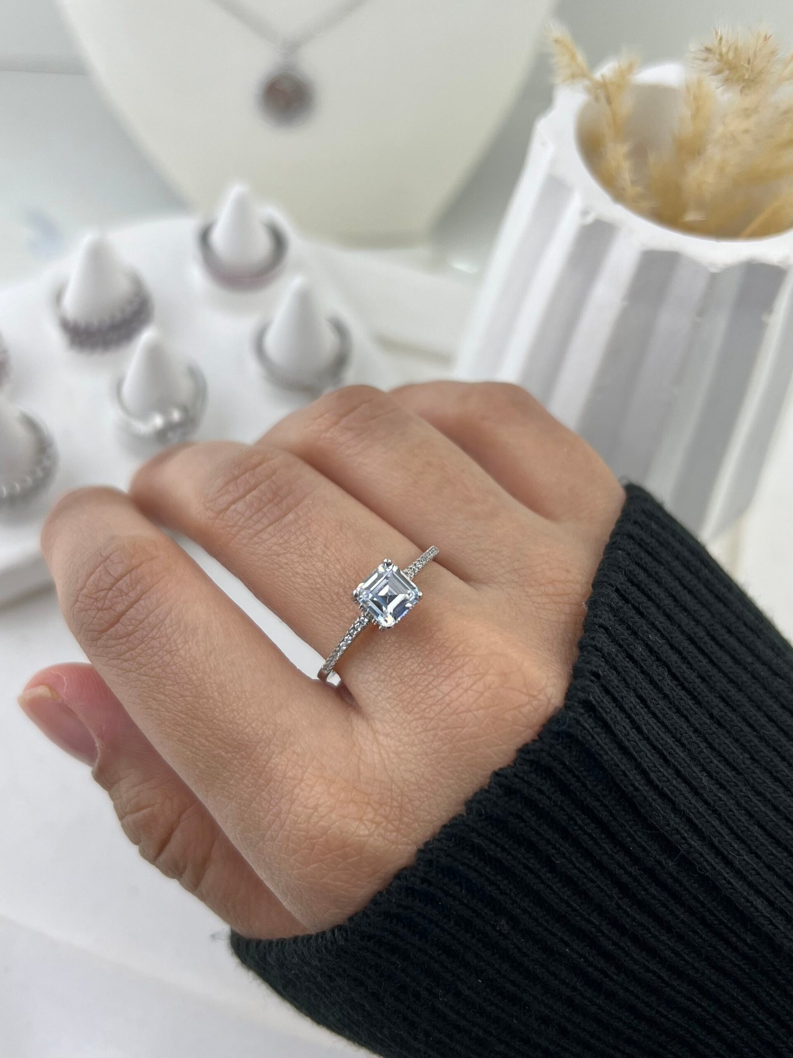 La bague Serenity séduit par sa pierre centrale rectangulaire taille émeraude, délicatement sertie sur un anneau en argent pavé de cristaux scintillants. Ses lignes épurées et son éclat maîtrisé captent la lumière avec douceur, créant un bijou à l’allure calme, élégante et intemporelle.