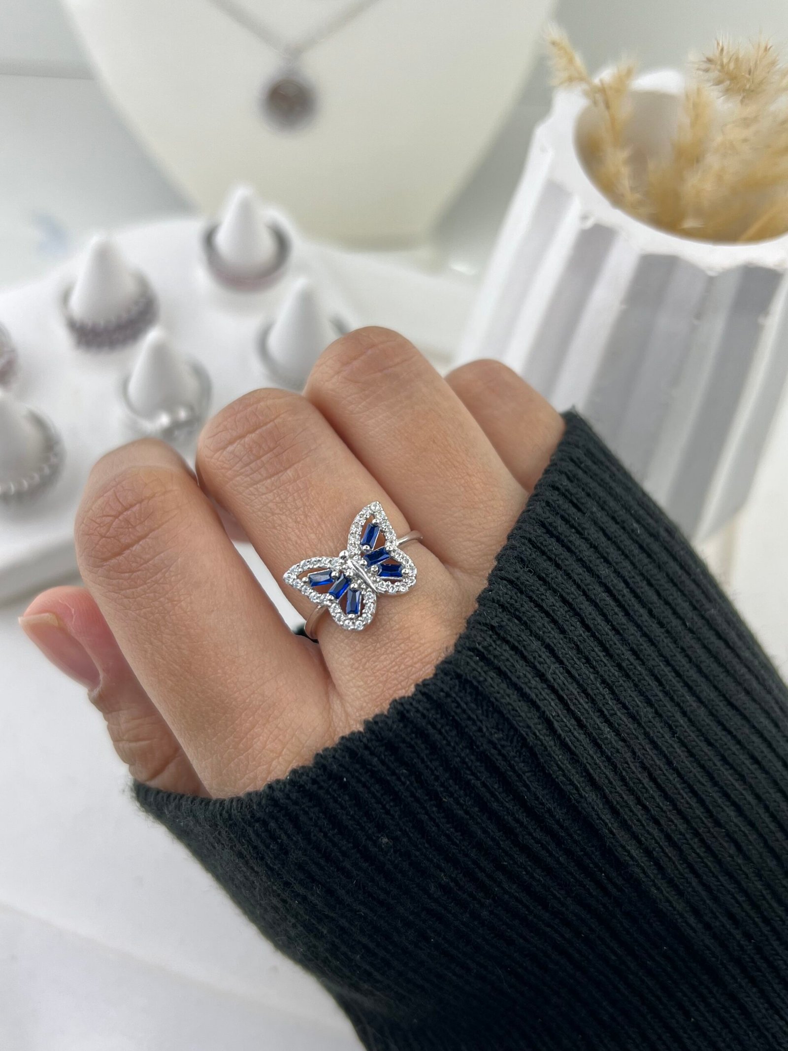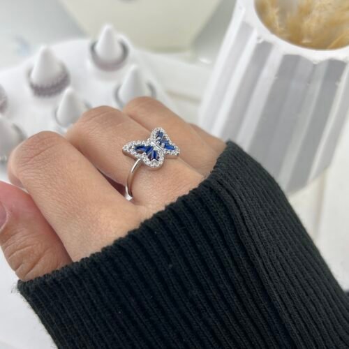 La Bague Yara (Bleue) séduit par son design enchanteur et captivant, avec un papillon délicatement pavé de cristaux bleu saphir et de cristaux transparents scintillants sur métal argenté. Les ailes finement ciselées captent la lumière avec éclat, créant un effet poétique et majestueux, où chaque cristal apporte texture, profondeur et élégance royale.