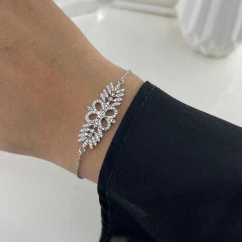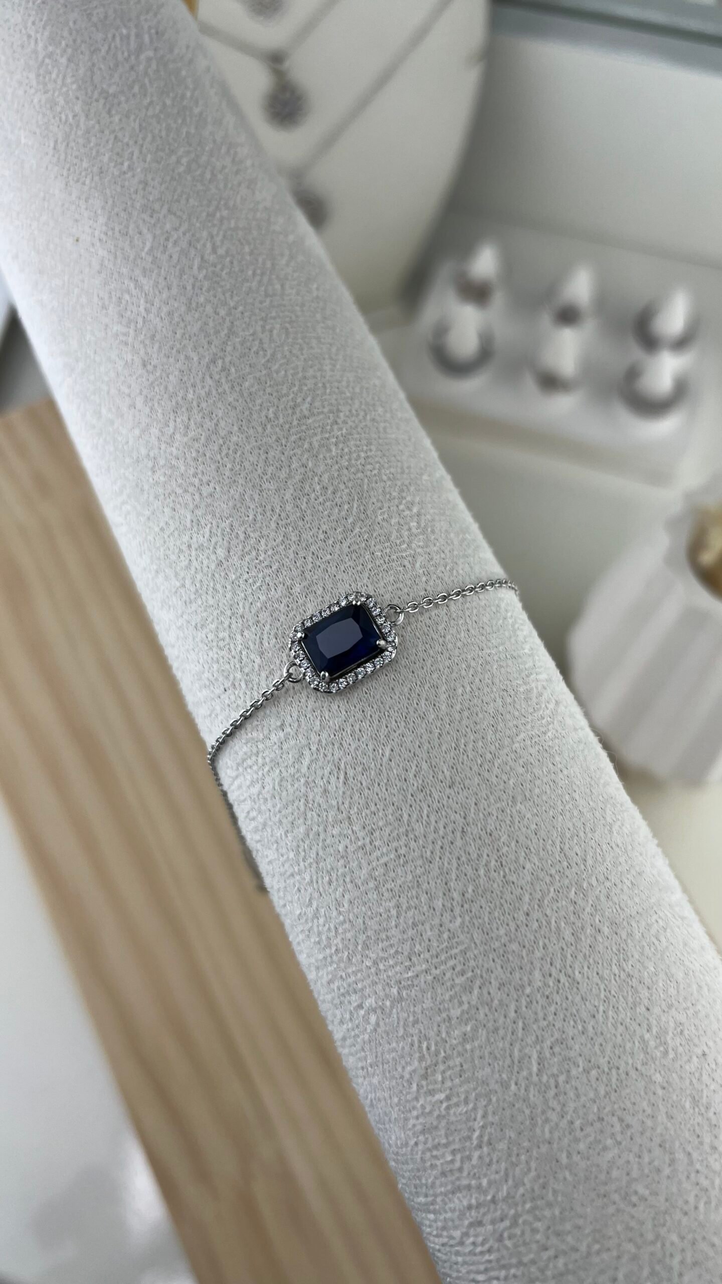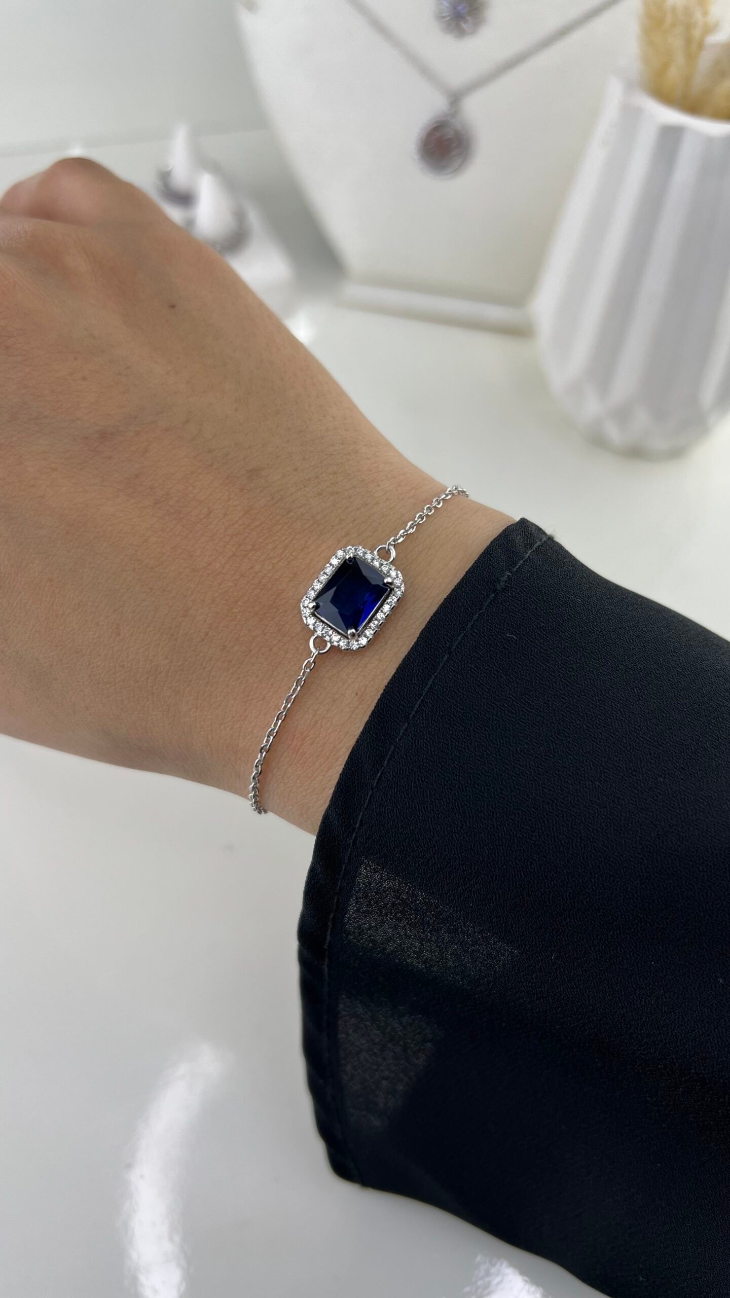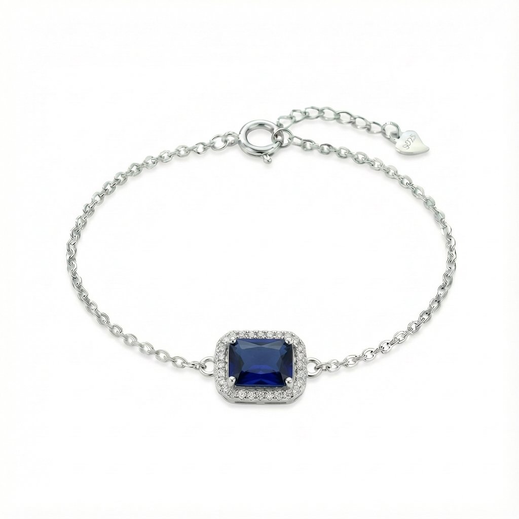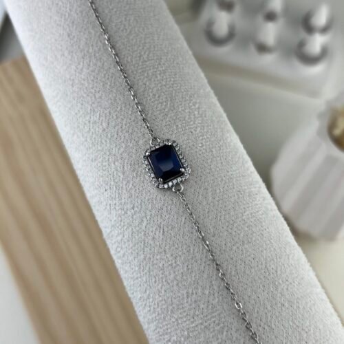 Le bracelet Bleu séduit par sa pierre saphir rectangulaire d’un bleu profond, magnifiquement entourée d’un halo de cristaux scintillants sur une chaîne fine en argent. Ce point focal élégant capte la lumière avec intensité, créant un bijou à la fois raffiné et luxueux.