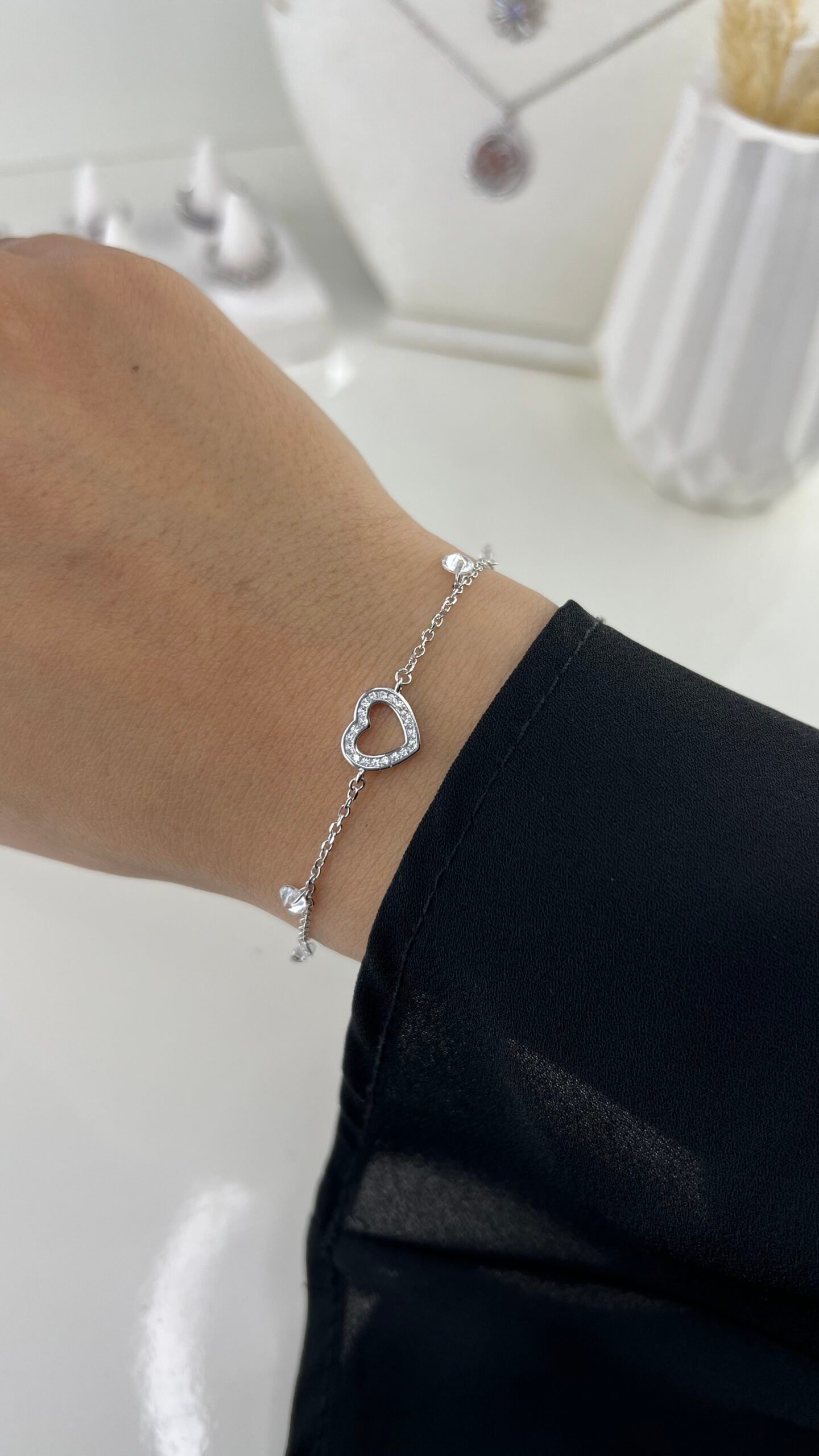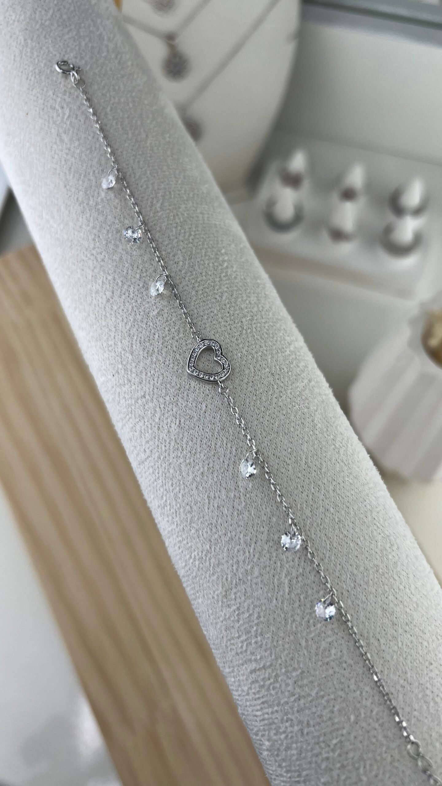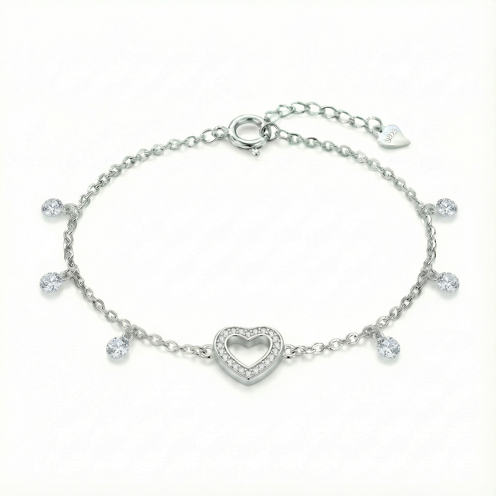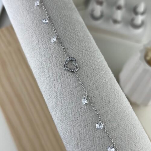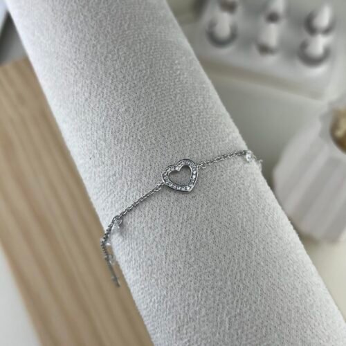 Le bracelet Cœur séduit par son charm cœur délicatement serti de cristaux scintillants, accompagné de petites pierres lumineuses harmonieusement réparties le long d’une chaîne fine en argent. Son design aérien et romantique capte la lumière avec subtilité, offrant un bijou à la fois doux, élégant et féminin.
