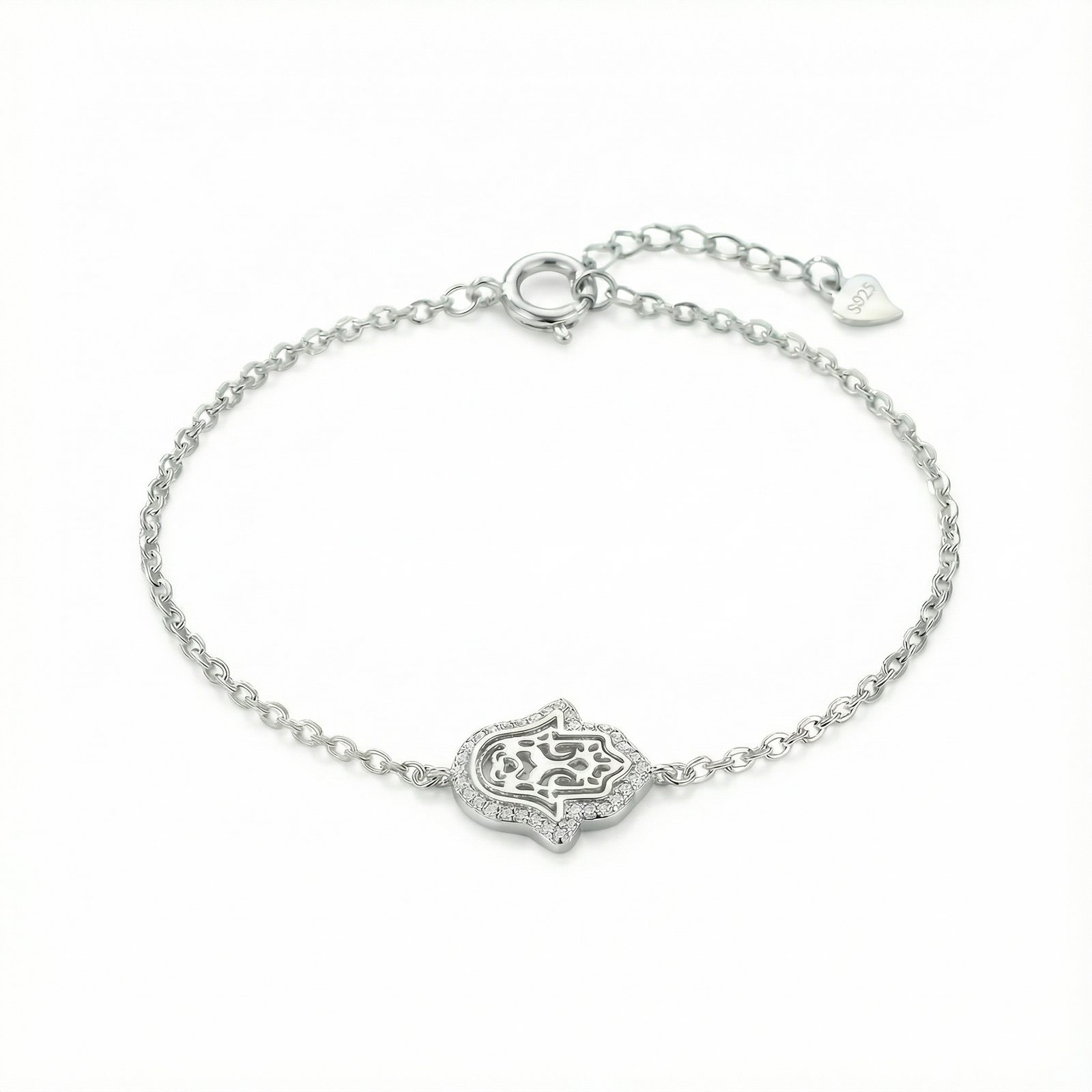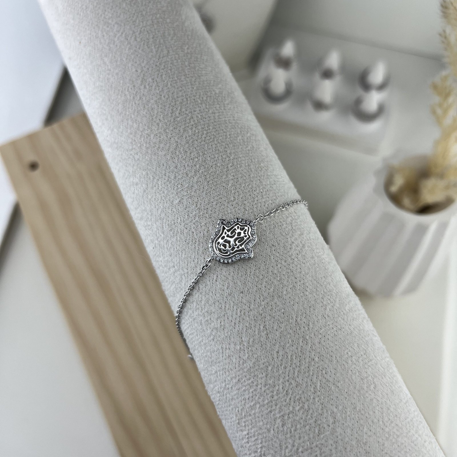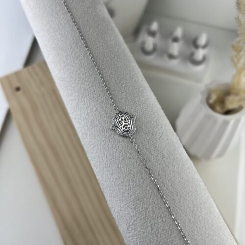 Le bracelet Khemissa séduit par son charm en forme de Khemissa, finement ciselé en argent et délicatement positionné sur une chaîne fine et raffinée. Ce symbole protecteur millénaire, orné de motifs géométriques gravés avec précision, allie spiritualité et sophistication dans un bijou minimaliste et élégant.