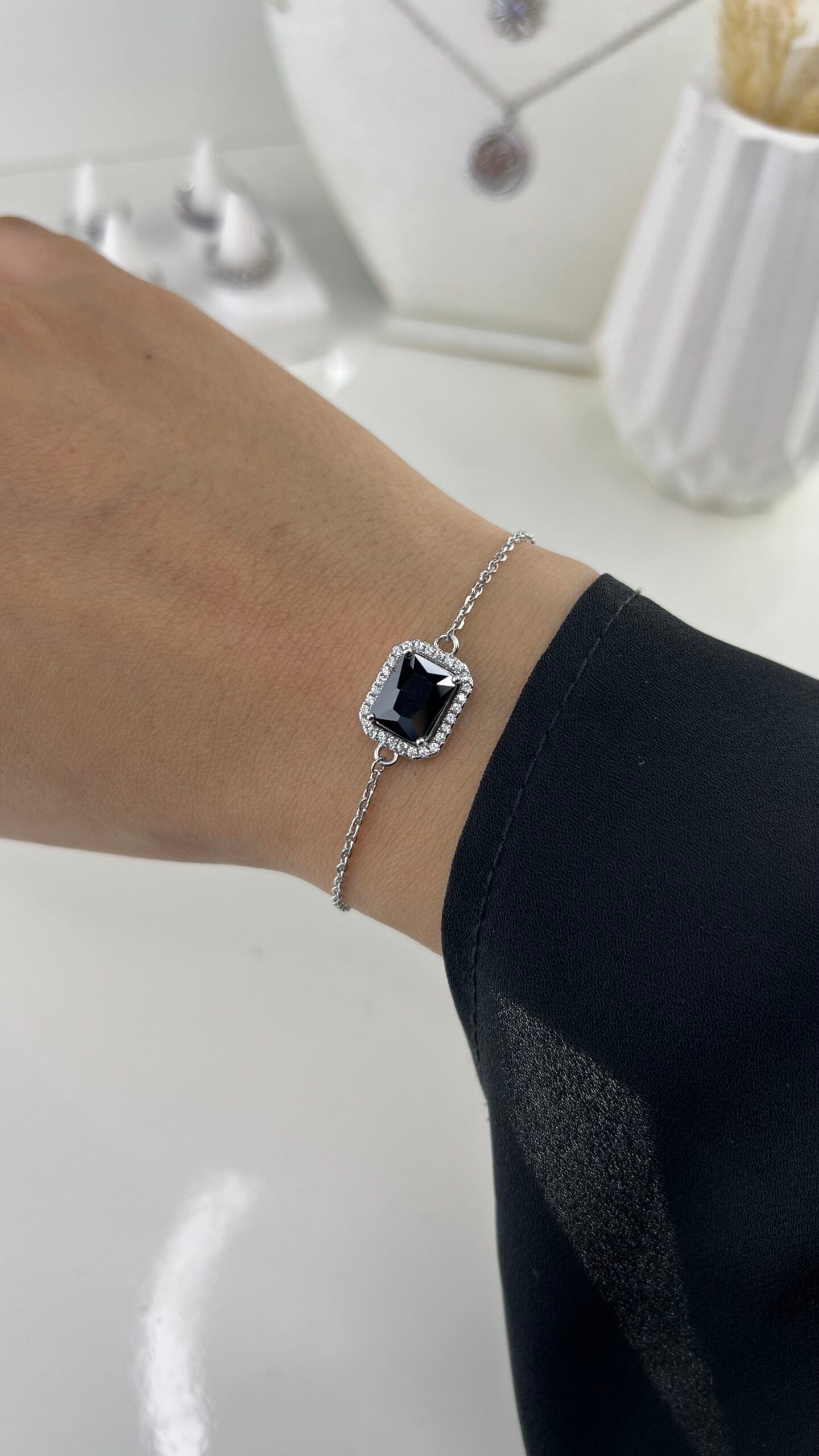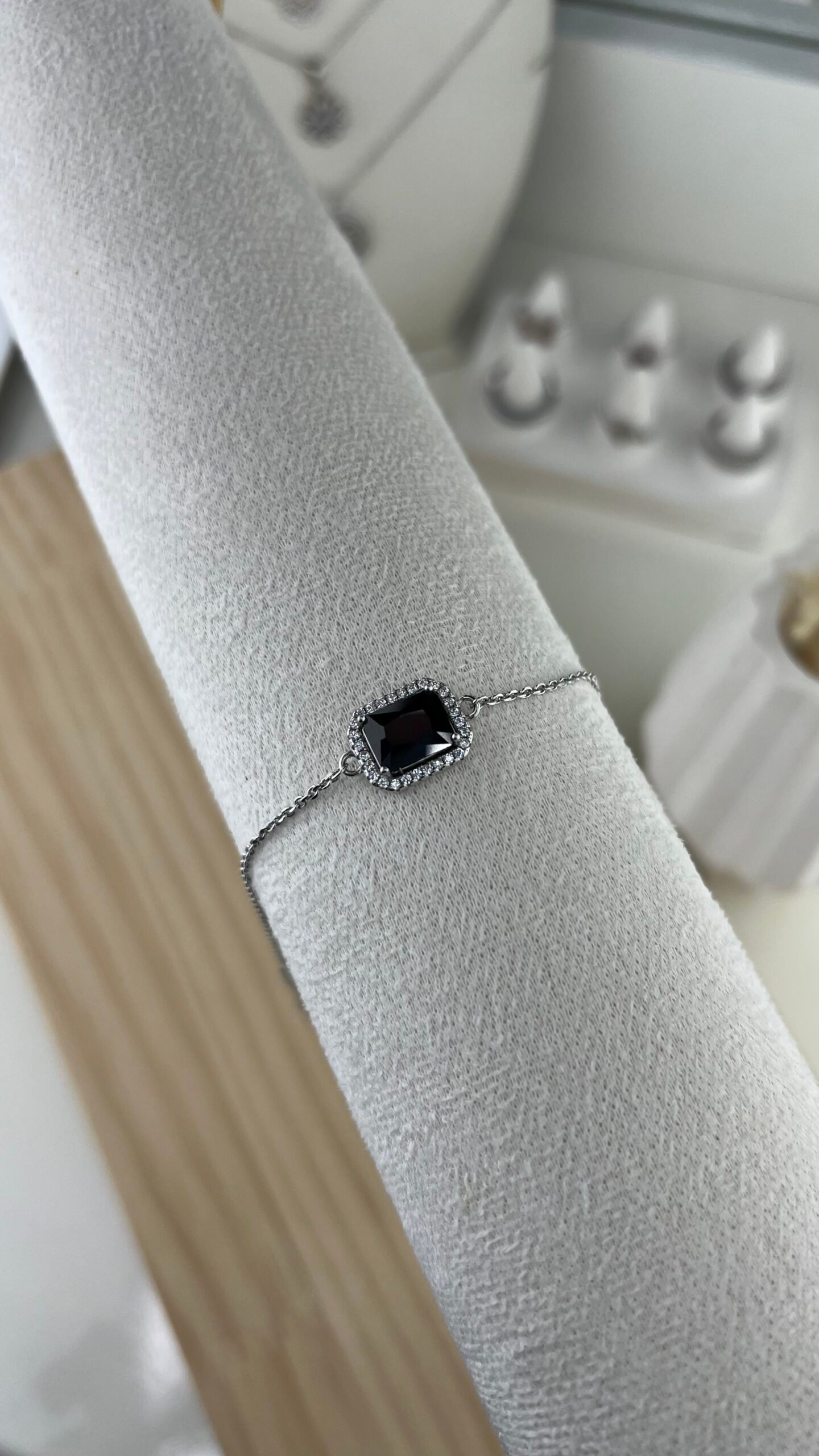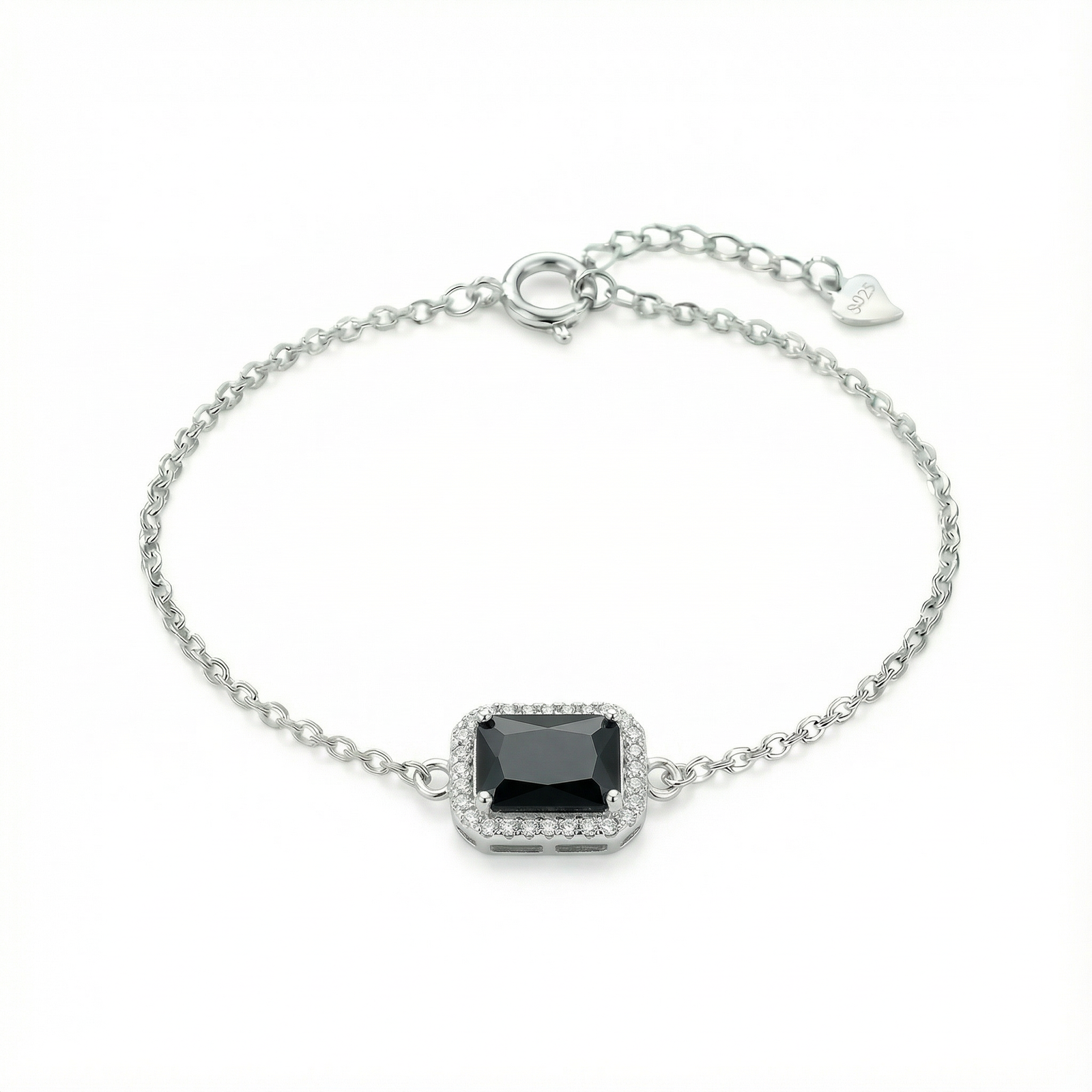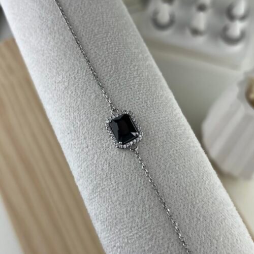 Le bracelet Noir séduit par sa pierre onyx rectangulaire d’un noir profond, délicatement entourée d’un halo de cristaux scintillants sur une chaîne fine en argent. Ce contraste saisissant entre la pierre sombre et l’éclat des cristaux crée un bijou à la fois audacieux et raffiné, parfait pour sublimer votre style avec discrétion et sophistication.