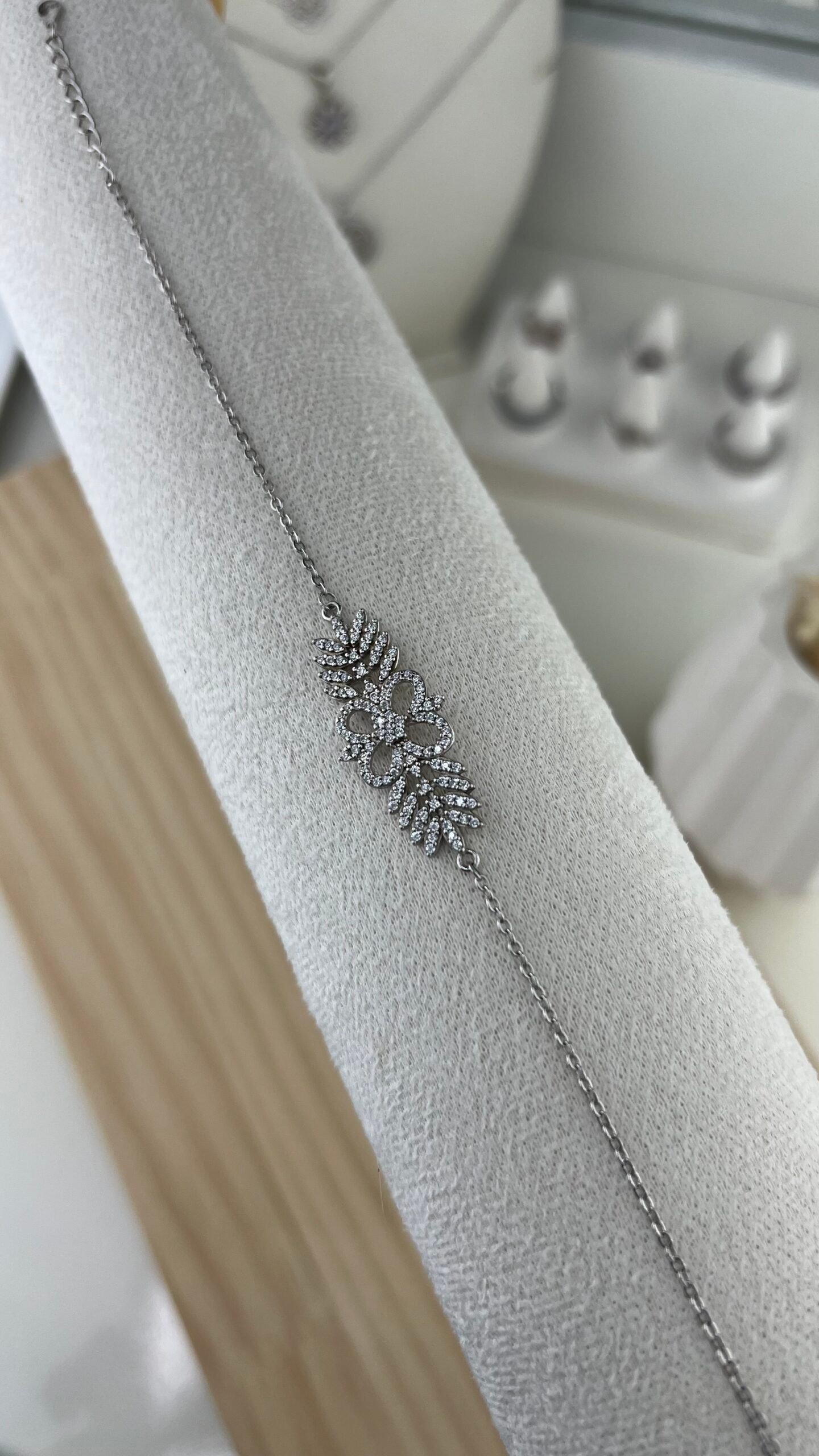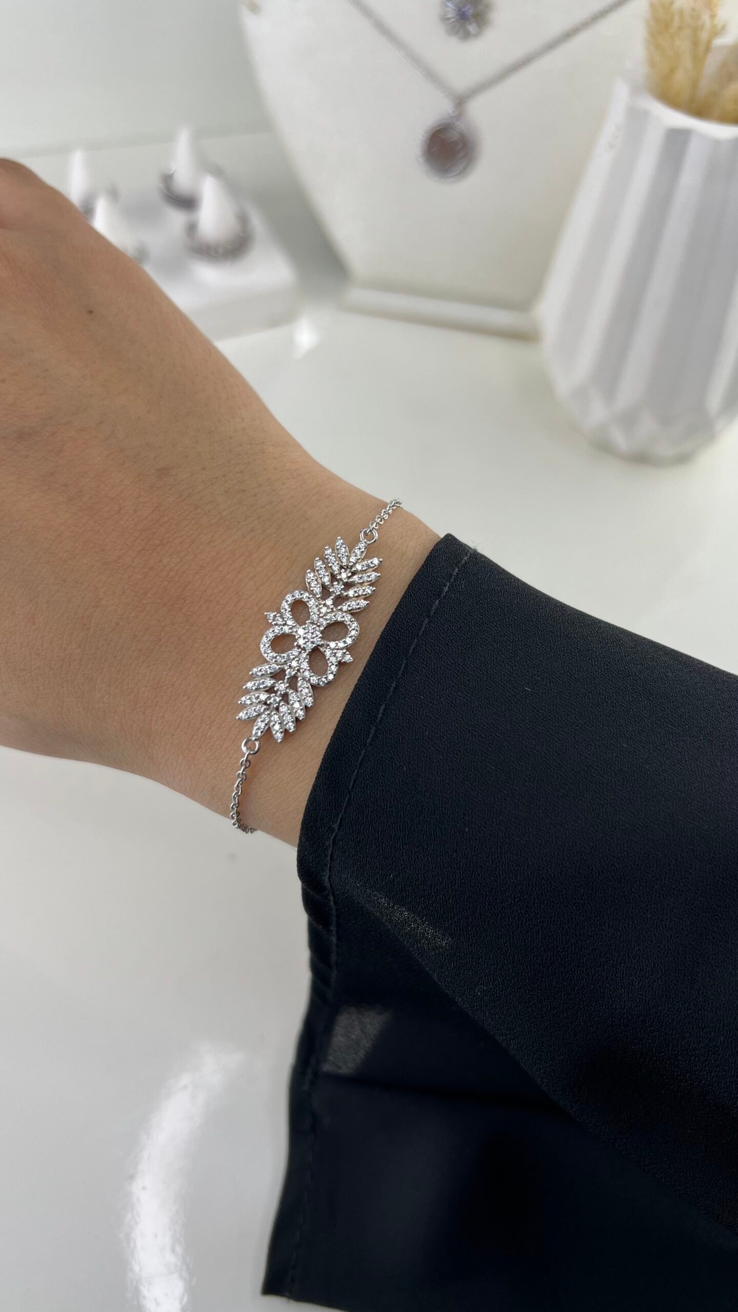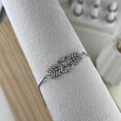 Le bracelet Princesse séduit par son motif feuillage élégant, entièrement pavé de cristaux scintillants disposés en branches délicates et gracieuses sur une chaîne fine en argent. Inspiré de la nature et de la royauté, son design raffiné crée un effet lumineux et majestueux qui habille le poignet avec distinction.