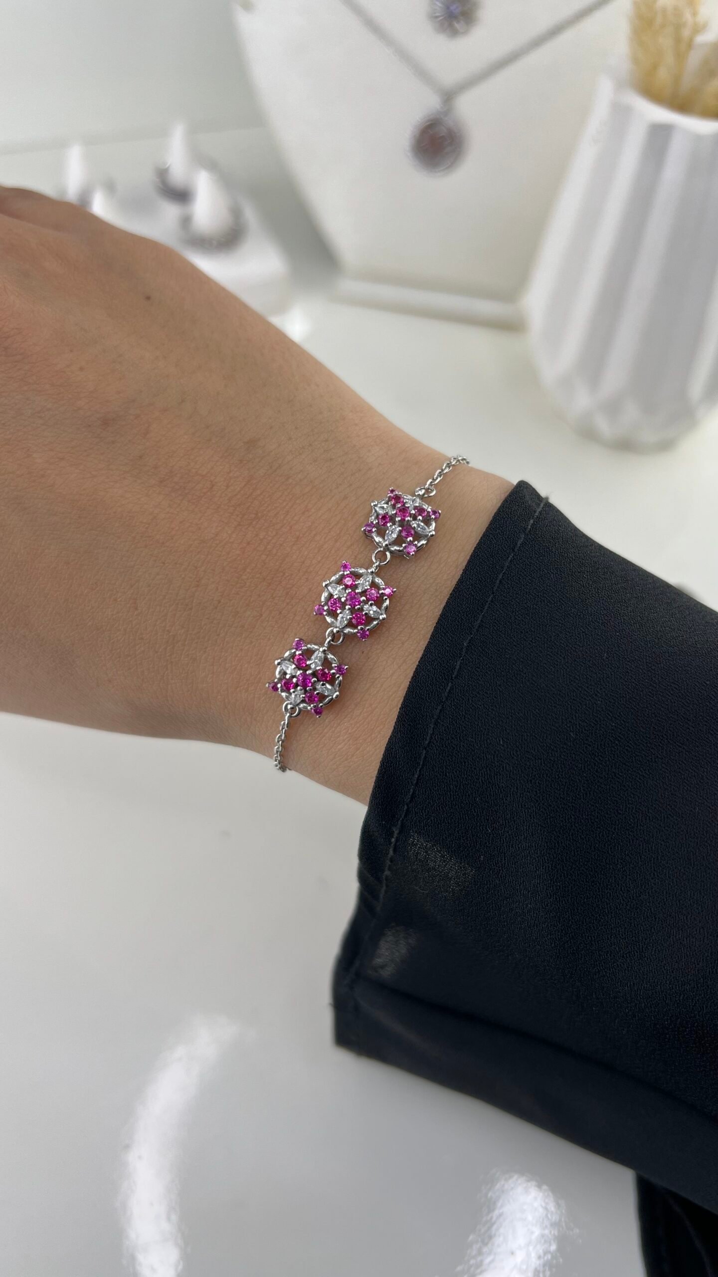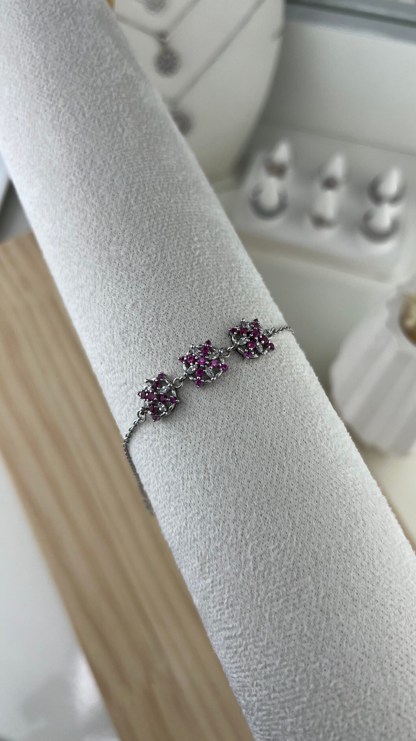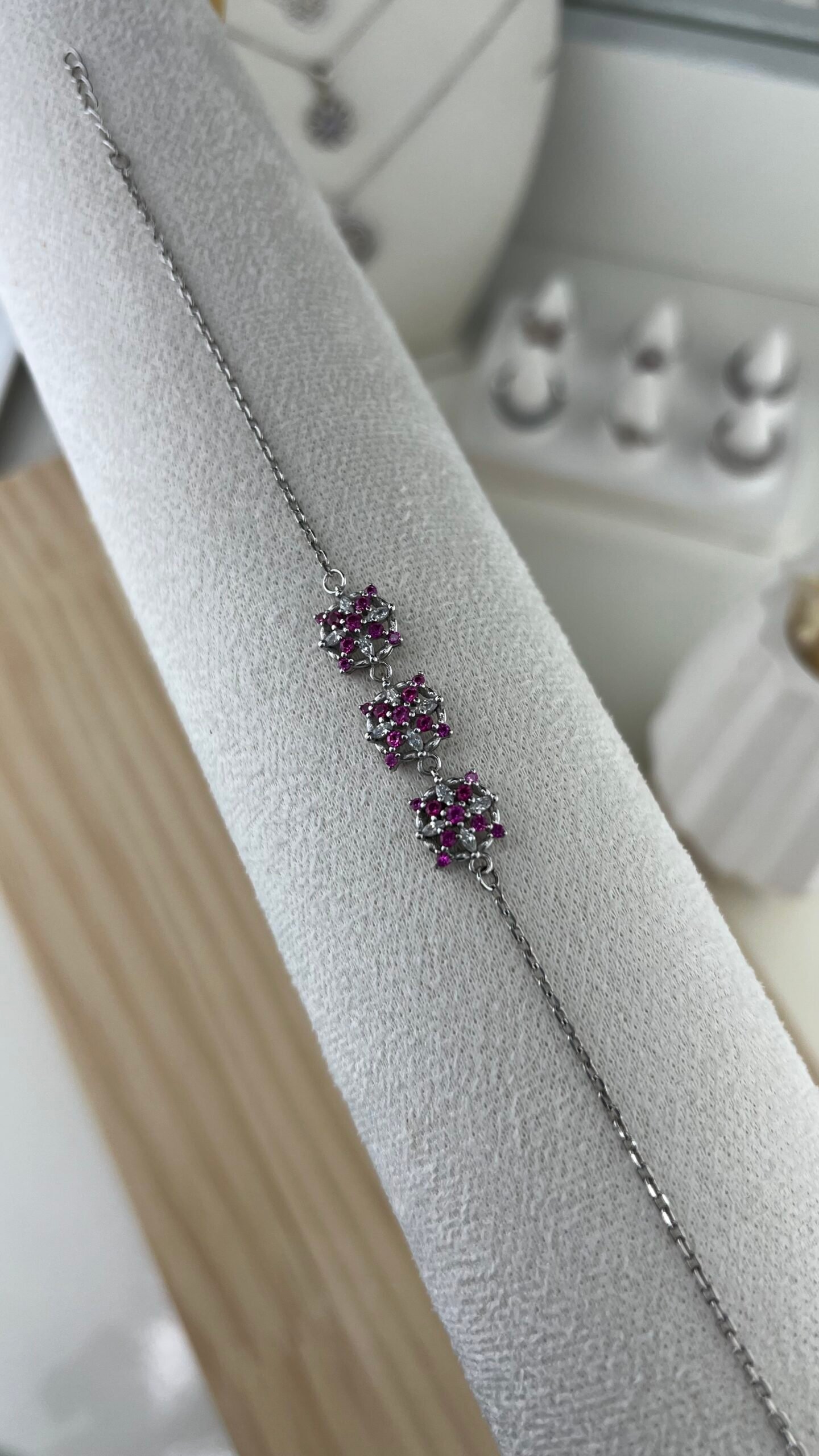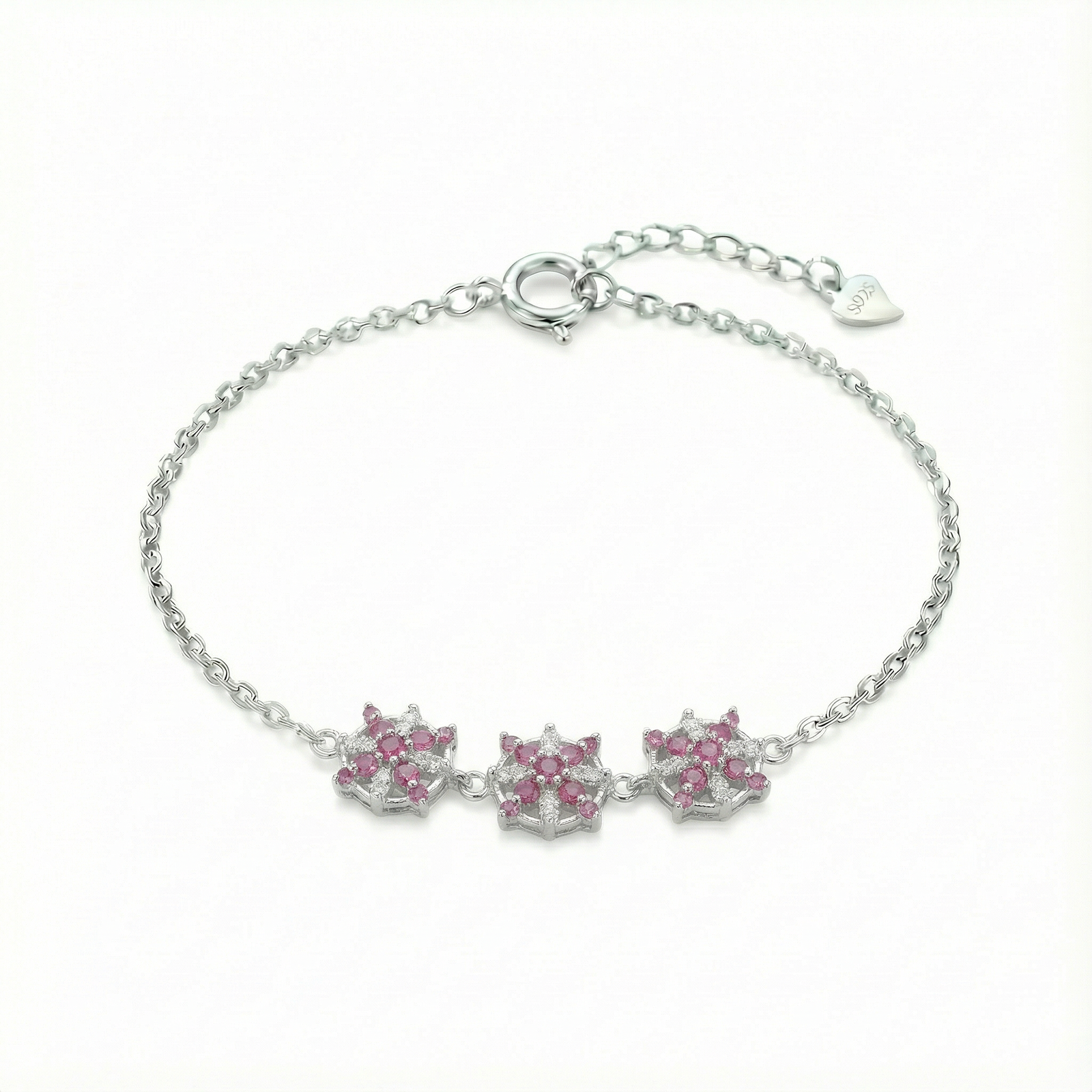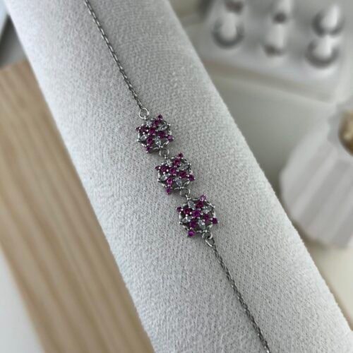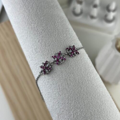 Le bracelet Tiffany séduit par ses trois charms en forme de fleurs, délicatement pavés de pierres roses éclatantes, harmonieusement espacés le long d’une chaîne fine en argent. Chaque fleur capte la lumière avec subtilité, créant un effet lumineux, féminin et raffiné qui attire le regard sans en faire trop.