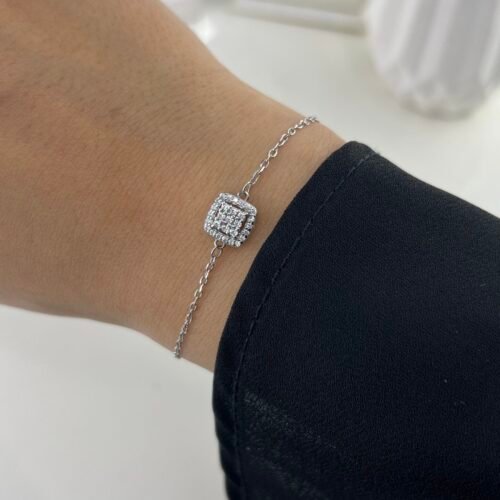 Le bracelet Vert séduit par sa pierre émeraude rectangulaire d’un vert profond, délicatement entourée d’un halo de cristaux scintillants sur une chaîne fine en argent. Ce point focal élégant capture la lumière avec intensité, offrant un bijou à la fois raffiné, luxueux et sophistiqué.