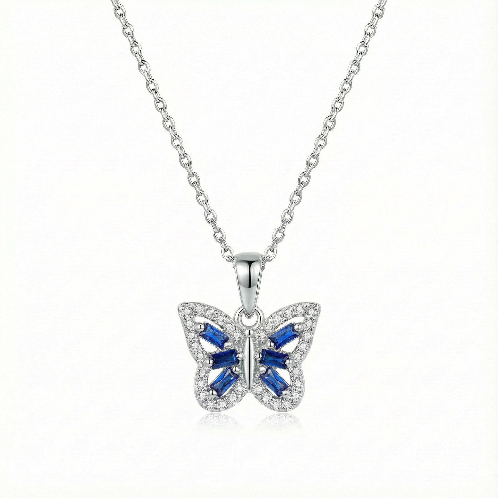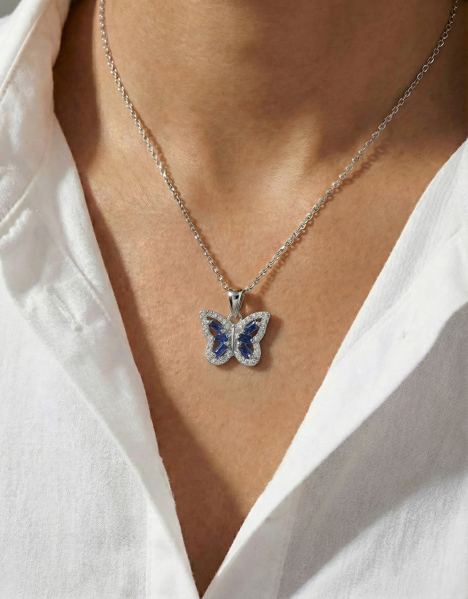 Le collier Yara Bleu séduit par son pendentif papillon aux ailes bleu saphir, délicatement orné de cristaux étincelants sur fond argenté. Cette pièce moderne et audacieuse apporte une touche de raffinement et de personnalité, parfaite pour exprimer votre style unique avec élégance.