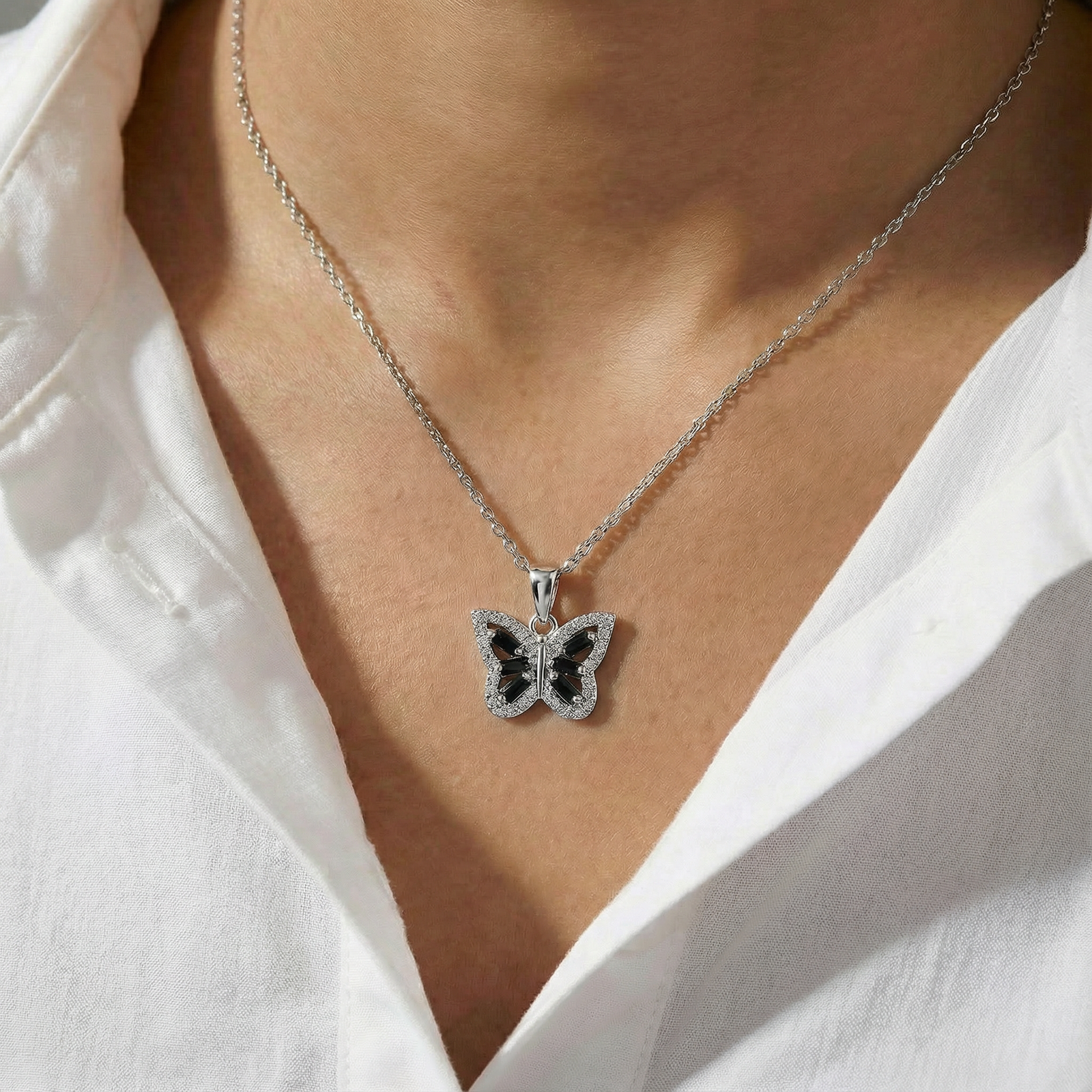 Le collier Yara Noir séduit par son pendentif papillon aux ailes profondes, sublimé de cristaux étincelants qui captent la lumière avec sophistication. Audacieuse et mystérieuse, cette pièce apporte une touche de glamour contemporain, parfaite pour se démarquer lors des occasions spéciales ou affirmer votre style au quotidien.