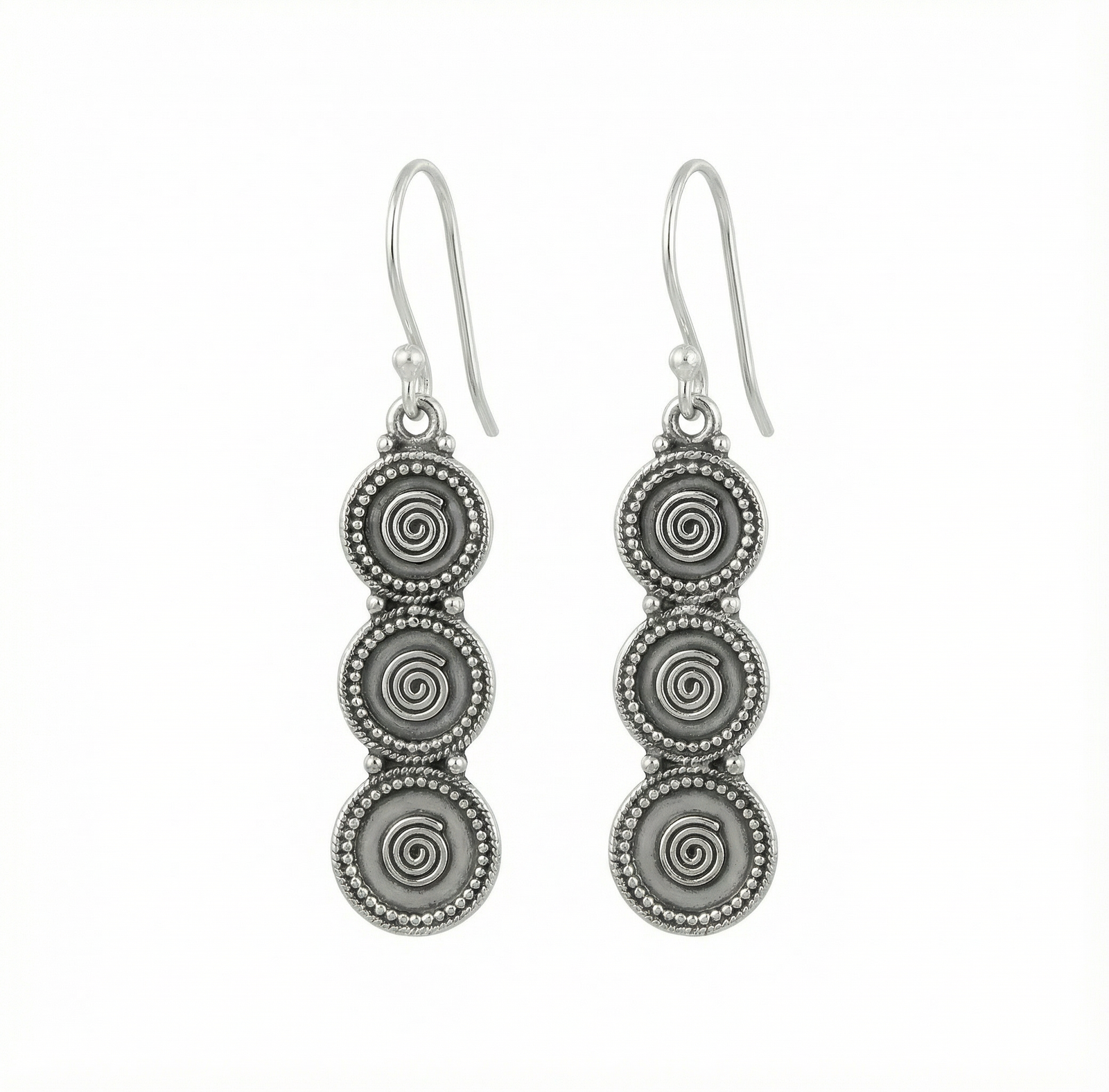 Les Boucles d’Oreilles Swirl Drops enchantent par leur design linéaire et élégant, composées de trois disques ovales superposés ornés de motifs spirales concentriques argentés sur fond noir. Chaque ovale capte la lumière avec subtilité, la gravure fine des spirales créant texture, profondeur et mouvement hypnotique. La silhouette allongée suspendue à des crochets argentés offre un port sophistiqué et une présence contemporaine élancée.